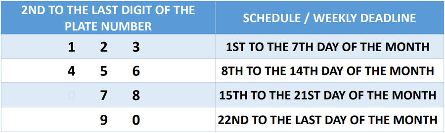 WEEKLY SCHEDULE IS BASED ON THE 2ND TO THE LAST DIGIT OF THE PLATE NUMBER