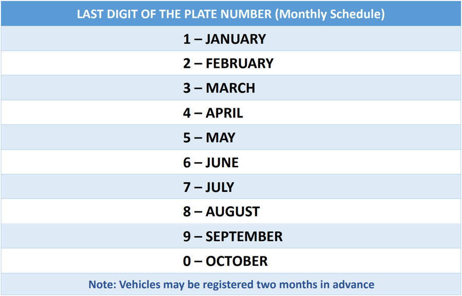 MONTHLY SCHEDULE IS BASED ON THE LAST DIGIT OF THE PLATE NUMBER